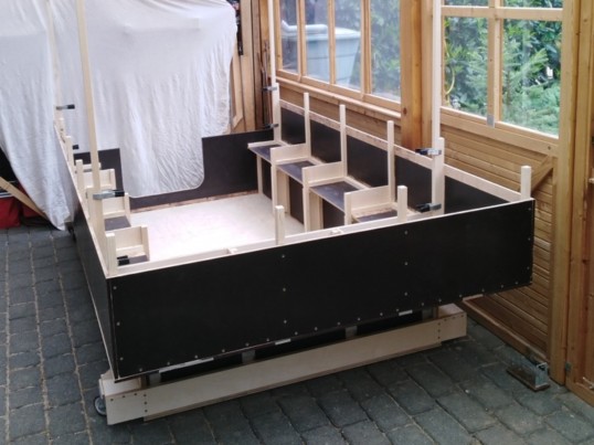 Fangen wir an mit Teil 1, Aufbau der unteren Wanne aus Siebdruckplatten, der Hebeböcke